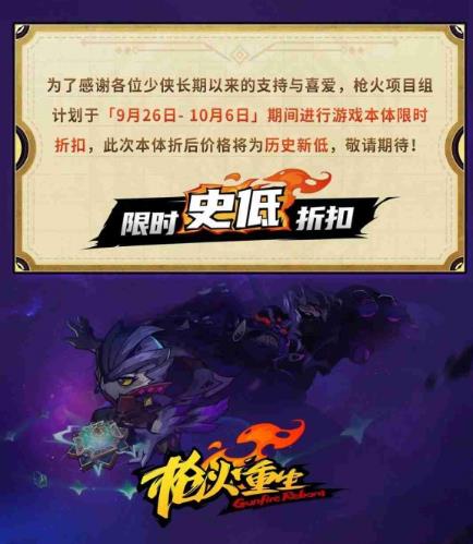 同时为了感谢各位少侠长期以来的支持与喜爱,枪火项目组计划于2023年9月26日起进行游戏本体限时折扣(9月26日起为期11天),此次本体折后价格将为历史新低,敬请期待!